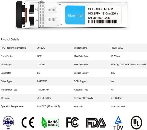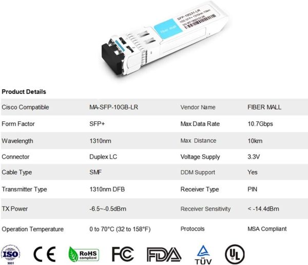 - The SFP+ transceivers are high performance, cost effective modules supporting data rate of 10Gbps and 10km transmission distance with SMF.