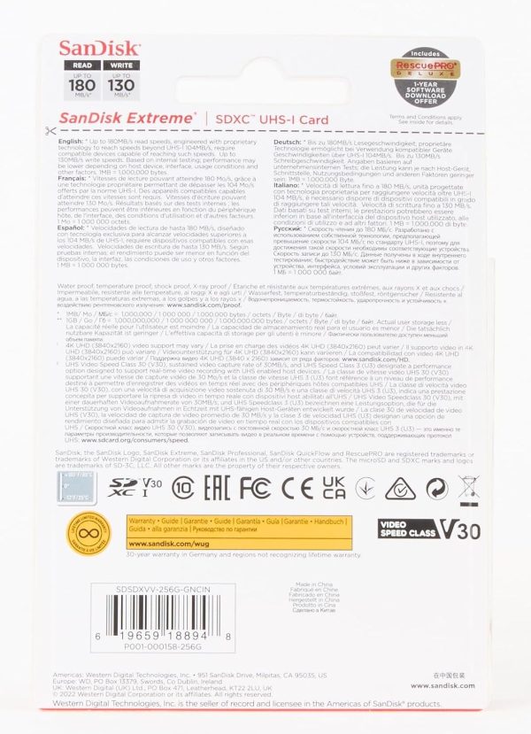 With the SanDisk Extreme SD UHS-I memory card save time transferring media with read speeds of up to 170MB/s(1) powered by SanDisk QuickFlow Technology(2). Pair with the SanDisk Professional PRO-READER SD and microSD to achieve maximum speeds (sold separately). With shot speeds of up to 80MB/s(1) and UHS speed Class 3 (U3)(4) recording, you’re ready to capture high-resolution, stutter-free 4K UHD video(3). | (1)Up to 170MB/s read speeds. Engineered with proprietary technology to reach speeds beyond UHS-I 104MB/s, require compatible devices capable of reaching such speeds. Write speeds up to 80MB/s. Based on internal testing; performance may be lower depending on host device, interface, usage conditions and other factors. 1MB=1,000,000 bytes. (2)SanDisk QuickFlow Technology is only available for 64GB, 128GB, 256GB, and 512GB capacities. 1GB=1,000,000,000 bytes. Actual user storage less. (4)UHS Speed Class 3 designates a performance option designed to support 4K UHD video recording with enabled UHS host devices. UHS Video Speed Class 30 (V30), sustained video capture rate of 30MB/s, designates a performance option designed to support real-time video recording with UHS enabled host devices. See the SD Association’s official website. (4)Full HD (1920×1080) and 4K UHD (3840 x 2160) video support may vary based upon host device, file attributes and other factors. See HD page on SanDisk site.