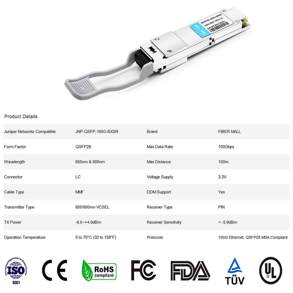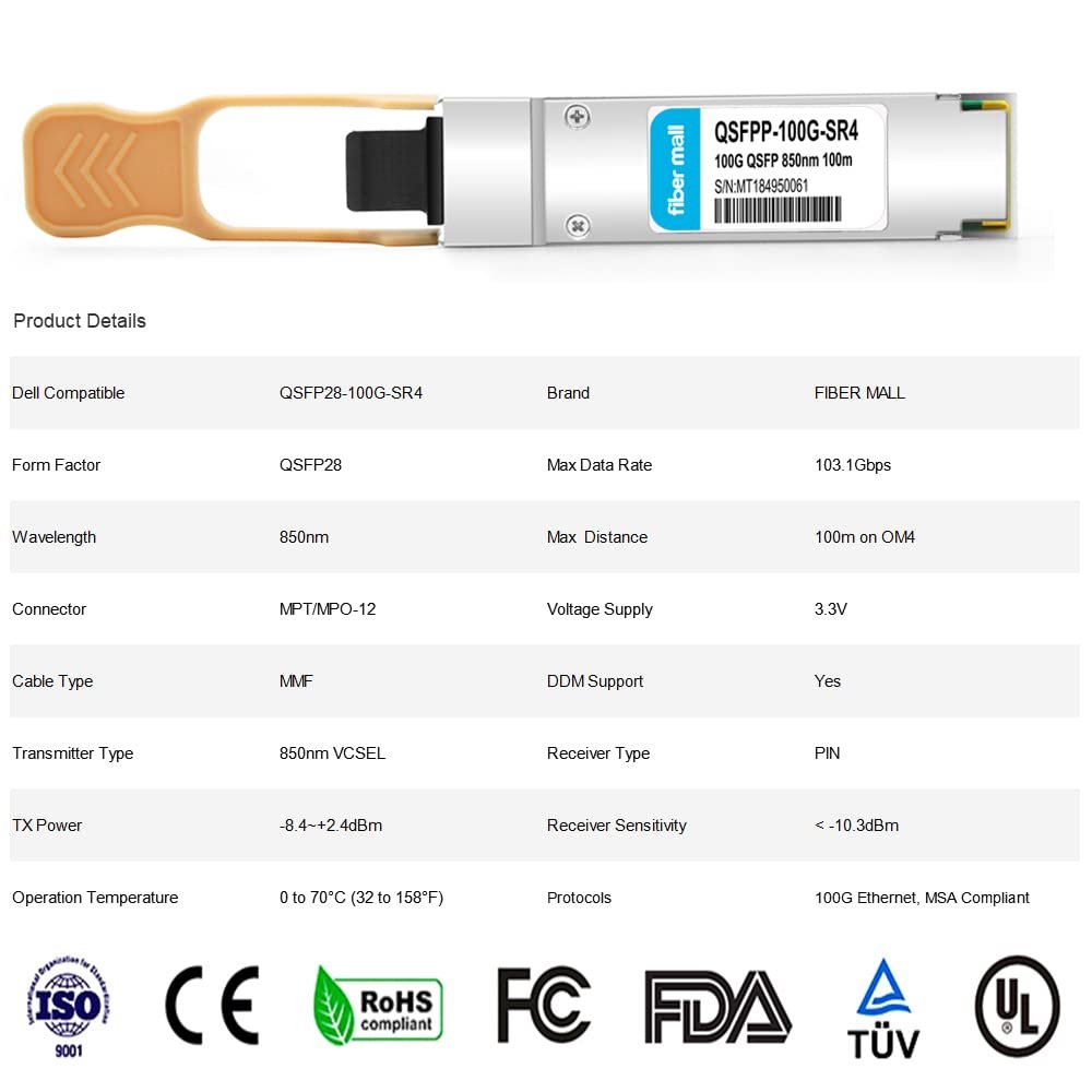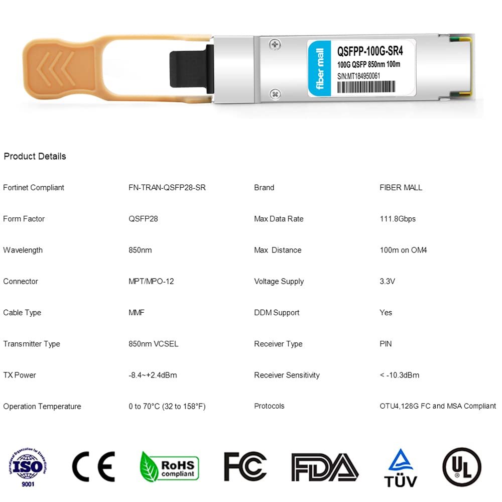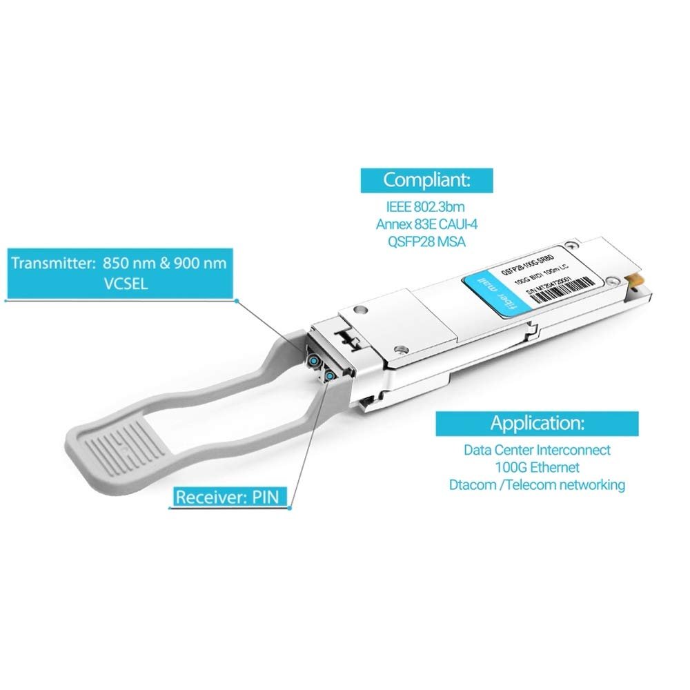 • 100G QSFP28 SR4 Transceiver Module (850nm MMF 100m MTP/MPO DDM)The 100G QSFP28 SR4 transceiver modules are designed for 100G Ethernet links over multimode fiber.