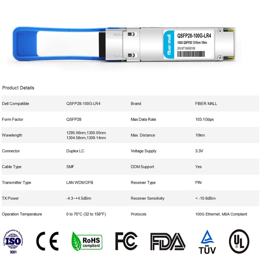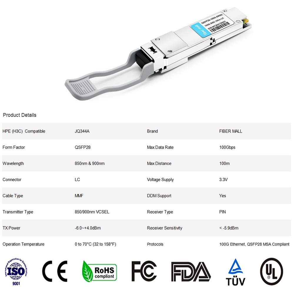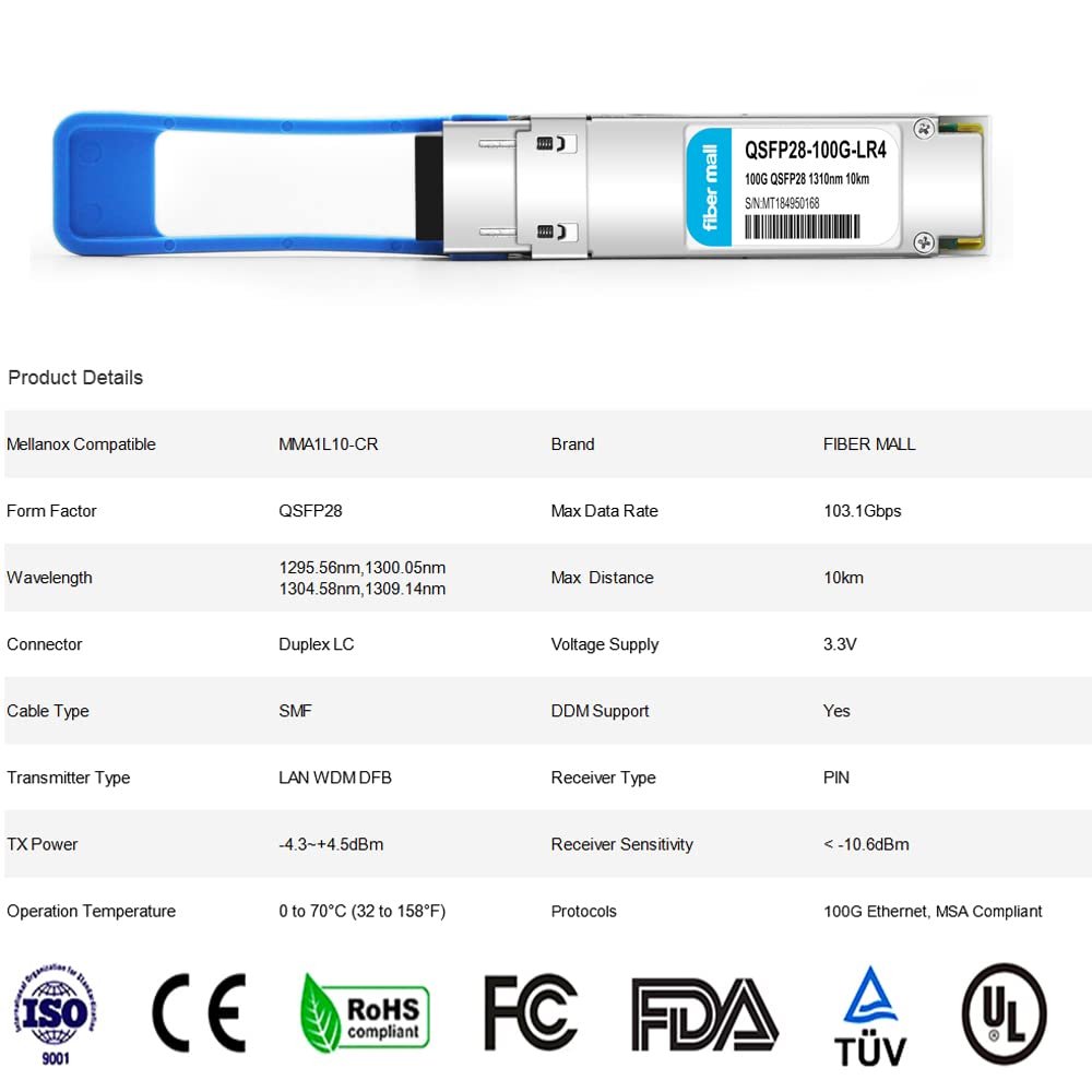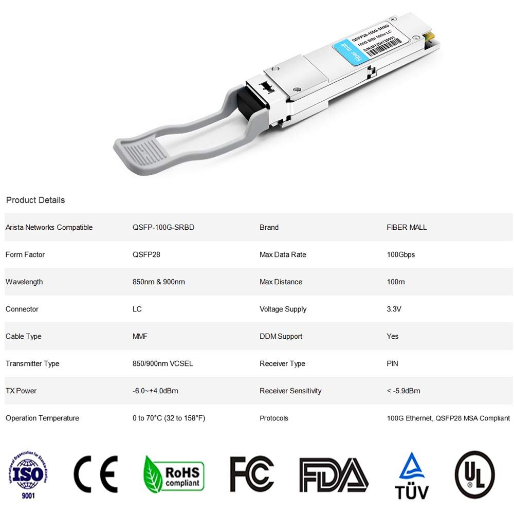• 100G QSFP28 SR4 Transceiver Module (850nm MMF 100m MTP/MPO DDM)The 100G QSFP28 SR4 transceiver modules are designed for 100G Ethernet links over multimode fiber.