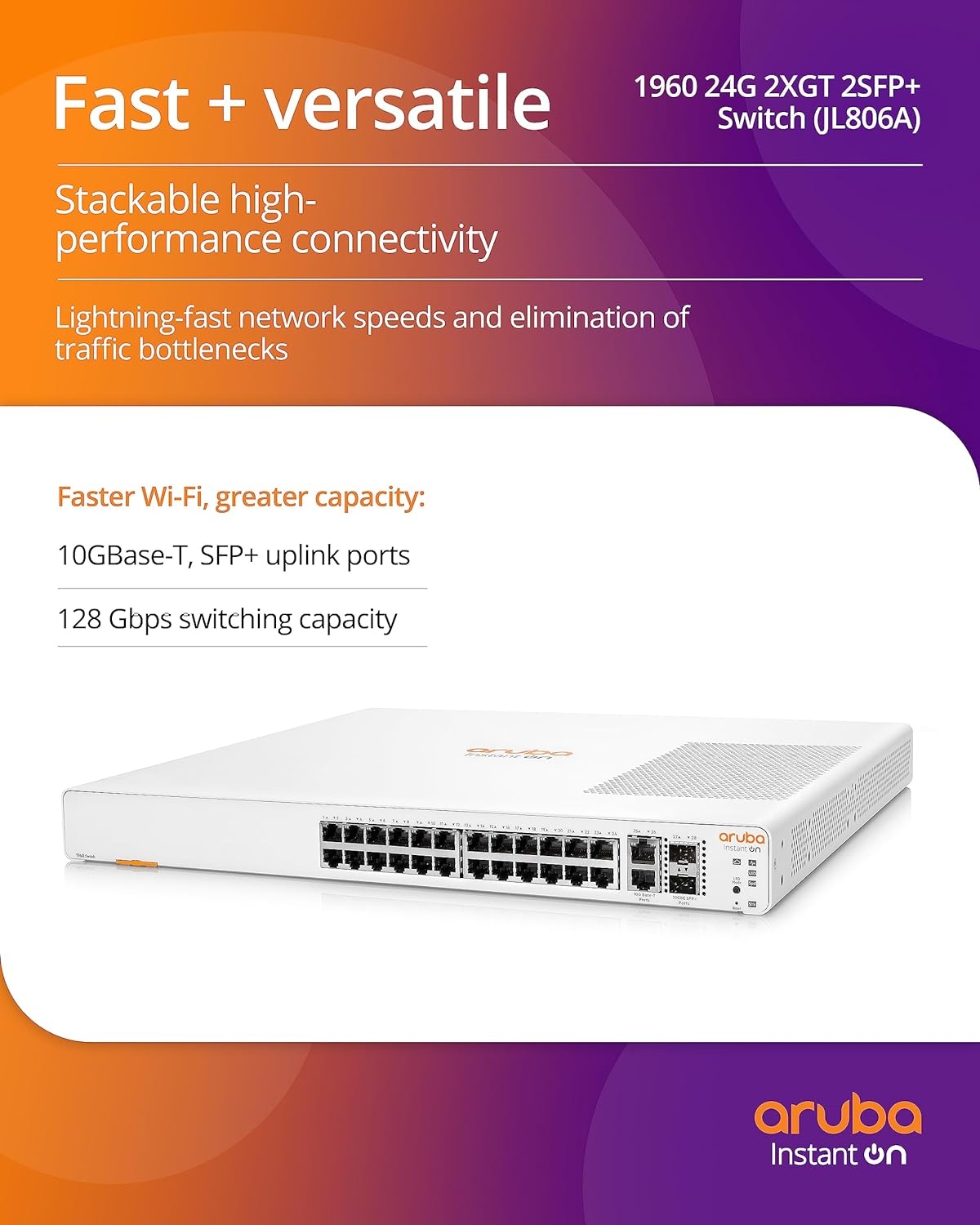 Aruba Instant On 1960 48-Port Gb Smart-Managed Layer 2+ Ethernet Switch | 48x 1G | 2X 10GBase-T + 2X SFP+ Uplink Ports | Stackable | US Cord (JL808A#ABA)