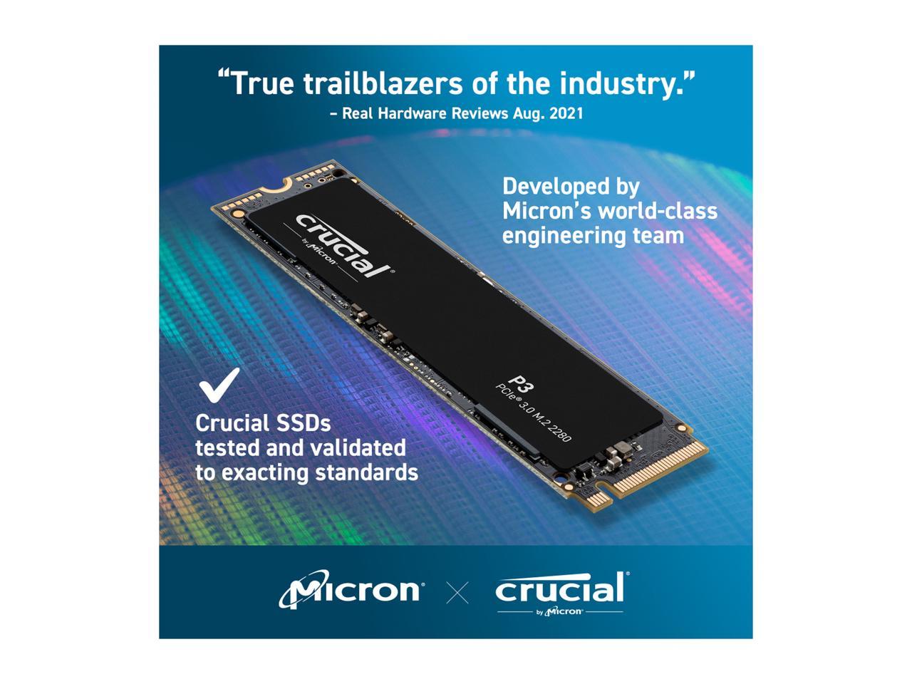 Basic bootup speeds wont cut it not at work, on the go, or in the game. But the Crucial P3 SSD is anything but basic. With NVMe performance thats nearly 5x faster than SATA and nearly 20x faster than HDD2, the P3 leaves older storage technology in the dust. With sequential read/write speeds up to 3500/3000MB/s, storage capacities up to 4TB, Micron Advanced 3D NAND, and innovative controller technology, the Crucial P3 gives you the speed you need for the price you want. Get faster bootups, downloads and file transfers, and store all your files, photos, videos, apps, and games with room to spare with the quality and dependability you expect from Crucial.
