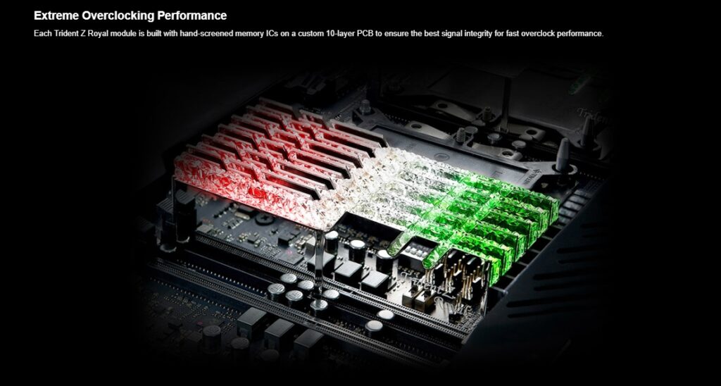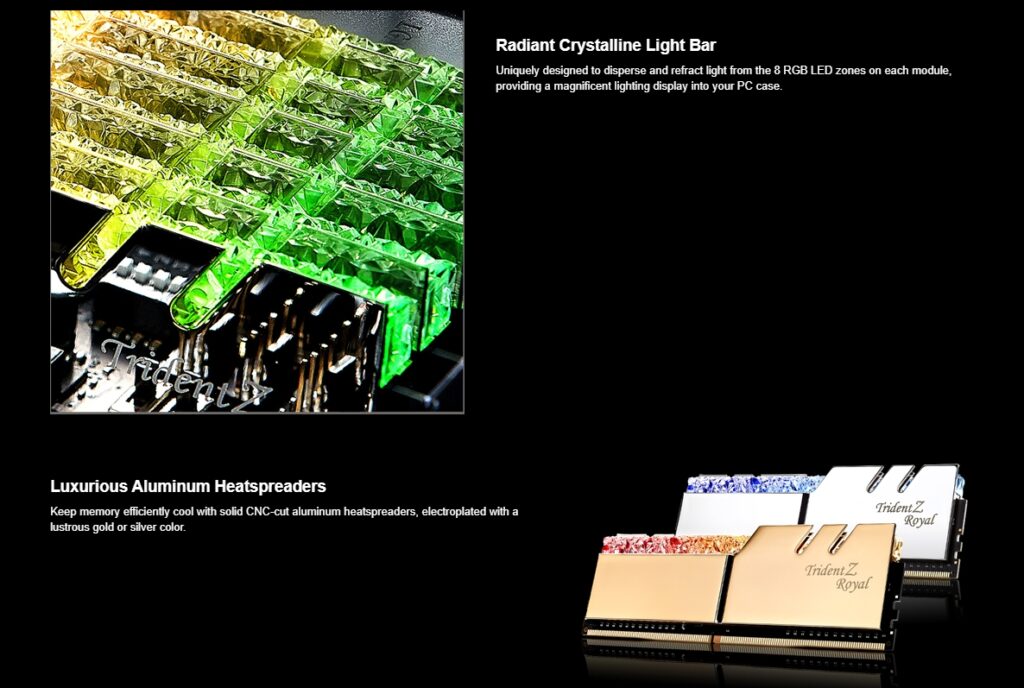 Unique crystalline light bar design. Mirrored-finish aluminum heatspreaders in gold or silver. Fluid rainbow wave default lighting effect. Hand-screened IC & custom 10-layer PCB for improved overclock performance. Intel XMP 2.0 Support. Do not mix memory kits. Memory kits are sold in matched kits that are designed to run together as a set. Mixing memory kits will result in stability issues or system failure. Memory kits will boot at the SPD speed at default BIOS settings with compatible hardware. For memory kits with XMP, enable XMP/DOCP/A-XMP in BIOS to reach the rated potential XMP overclock speed of the memory kit, subject to the use of compatible hardware. Reaching the rated XMP overclock speed and system stability will depend on the compatibility and capability of the motherboard and CPU used. Usage in any manner inconsistent with manufacturer specifications, warnings, designs, or recommendations will result lower speeds, system instability, or damage to the system or its components. Refer to the G.SKILL memory kit QVL on the G.SKILL website to check motherboard compatibility.