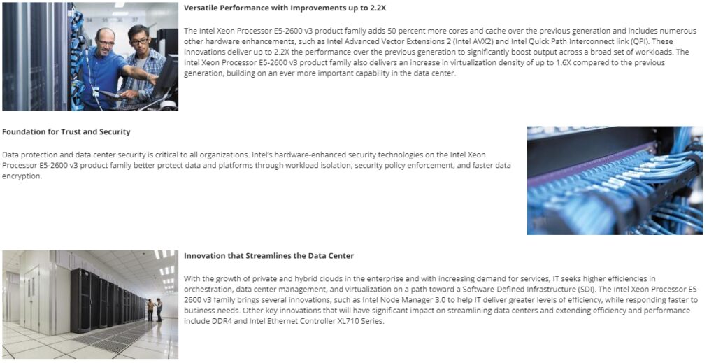 The new Intel Xeon processor E5-2600 v3 family product helps IT address the growing demands placed on infrastructure, from supporting business growth to enabling new services faster, delivering new applications in the enterprise, technical computing, communications, storage, and cloud. It also enables powerful, agile data centers by supporting a Software-Defined Infrastructure (SDI) to address the imminent need of greater flexibility with higher levels of automation and orchestration. In addition, with the significant benefits in virtualization and security, as well as a low total cost of ownership and Intels acclaimed product quality, the Intel Xeon Processor E5-2600 v3 product family is a compelling solution for any organization.