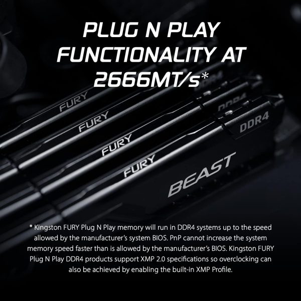 The Kingston FURY Beast DDR4 provides a powerful performance boost for gaming, video editing and rendering with speeds up to 3733MHz. This cost-effective upgrade is available in 2666MHzC3733MHz speeds, CL15C19 latencies, single module capacities of 4GBC32GB, and kit capacities of 8GBC128GB. It features Plug N Play automatic overclocking at 2666MHz and is both Intel XMP-ready and ready for AMD Ryzen. FURY Beast DDR4 stays cool with its stylish, low-profile heat spreader.