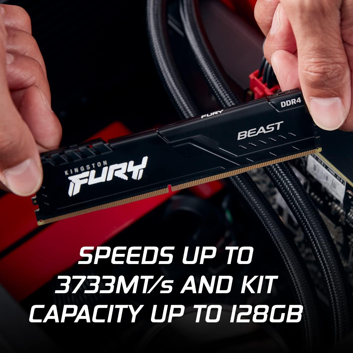 The Kingston FURY Beast DDR4 provides a powerful performance boost for gaming, video editing and rendering with speeds up to 3733MHz. This cost-effective upgrade is available in 2666MHzC3733MHz speeds, CL15C19 latencies, single module capacities of 4GBC32GB, and kit capacities of 8GBC128GB. It features Plug N Play automatic overclocking at 2666MHz and is both Intel XMP-ready and ready for AMD Ryzen. FURY Beast DDR4 stays cool with its stylish, low-profile heat spreader.