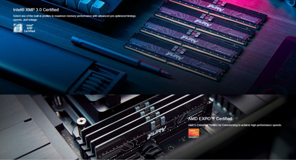 Power users can automatically get the most out of their systems with Kingston FURY Renegade Pro DDR5 RDIMM, or choose one of the built-in profiles for optimum timings, speeds, and voltage. Available in single-module capacities up to 32GB, kits of 4 up to 128GB, and kits of 8 up to 256GB.