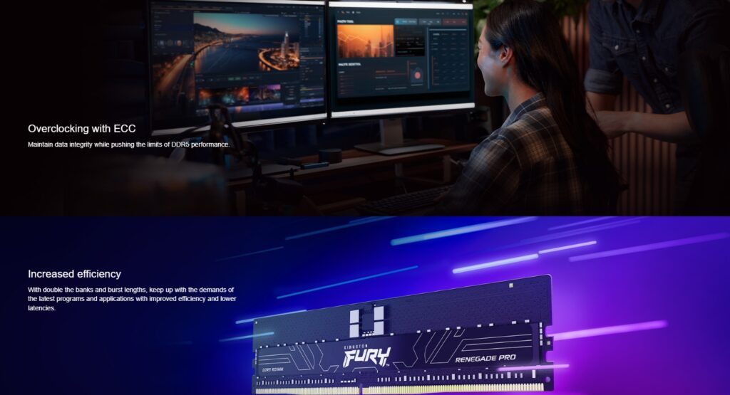 With over three decades of building reliable, high quality memory modules for the world??s largest data centers, Kingston proudly introduces a new line of overclockable server-class memory, Kingston FURY? Renegade Pro DDR5 RDIMM. To meet the computing demands of next-gen Intel? or AMD workstation and high-end desktop platforms requiring the use of DDR5 Registered DIMMs, Kingston FURY Renegade Pro DDR5 RDIMM provides creators, engineering and data science professionals with high performance memory normally reserved for gamers, without sacrificing the data integrity features and superior quality grade of Registered DIMMs.