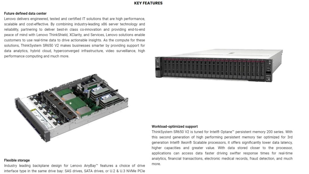 The Lenovo ThinkSystem SR650 V2 is an ideal 2-socket 2U rack server for small businesses up to large enterprises that need industry-leading reliability, management, and security, as well as maximizing performance and flexibility for future growth. The SR650 V2 is based on the 3rd generation Intel Xeon Scalable processor family (formerly codenamed “Ice Lake”) and the Intel Optane Persistent Memory 200 Series.