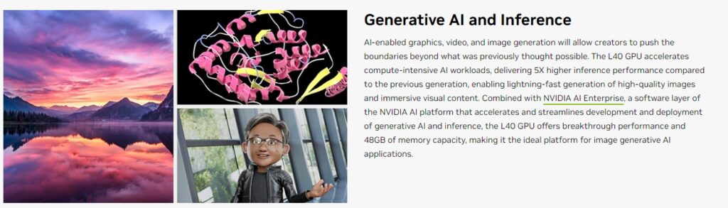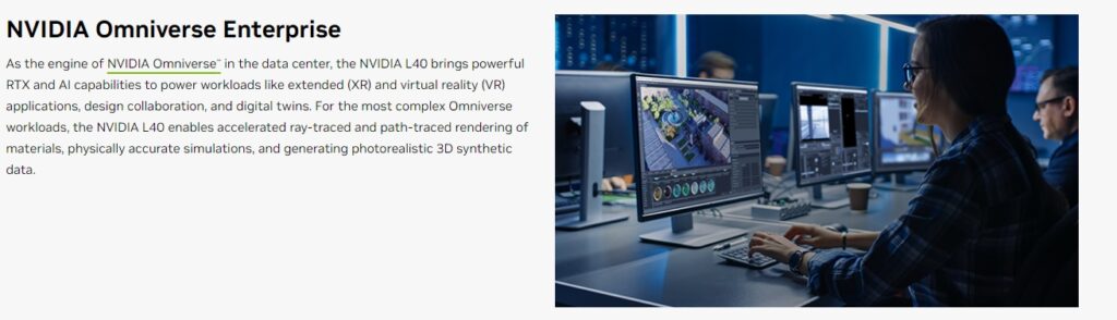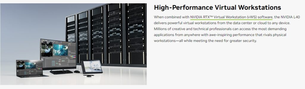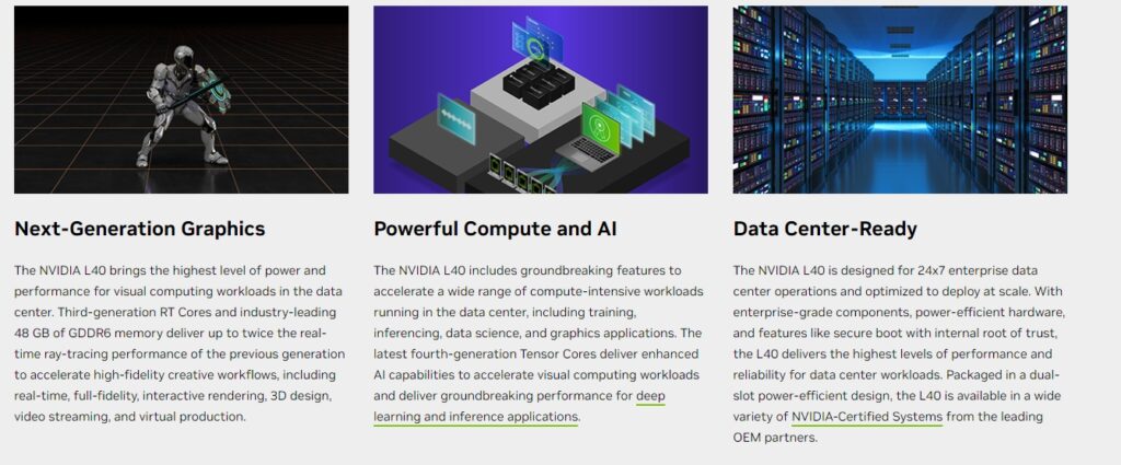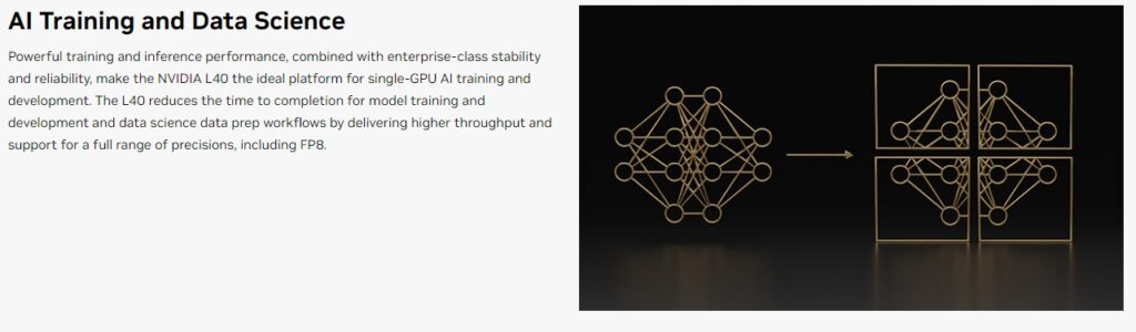 The L40 GPU is a high-performance graphics card designed for AI, deep learning, and high-performance computing applications. Built on advanced architecture, it delivers exceptional processing power and efficiency, making it ideal for demanding workloads. With its enhanced memory bandwidth and support for parallel processing, the L40 excels in handling large datasets and complex algorithms, empowering researchers and developers to push the boundaries of innovation.