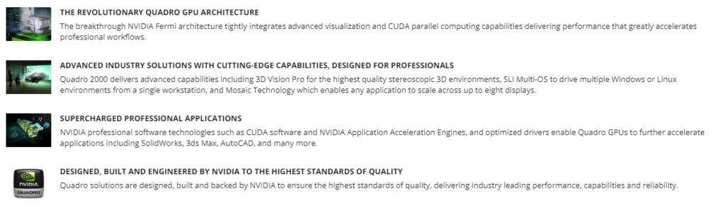 The NVIDIA Quadro 2000 provides an affordable, high performance experience that can transform how engineers, designers and animators work every day, supports Microsoft DirectX 11.0, OpenGL 4.1 and Shader Model 5.0 hardware acceleration, and drives a variety of displays including: CRTs, Digital Flat Panels, Projectors, and HDTVs.
