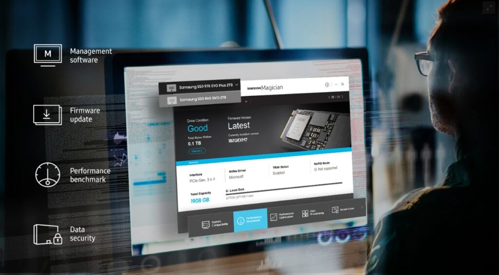 PERFORMANCE OPTIMIZATION AND DATA SECURITY: Seamless cloning and file transfers with Samsung Magician Software, the ideal SSD management solution for performance optimization and data security with automatic firmware updates