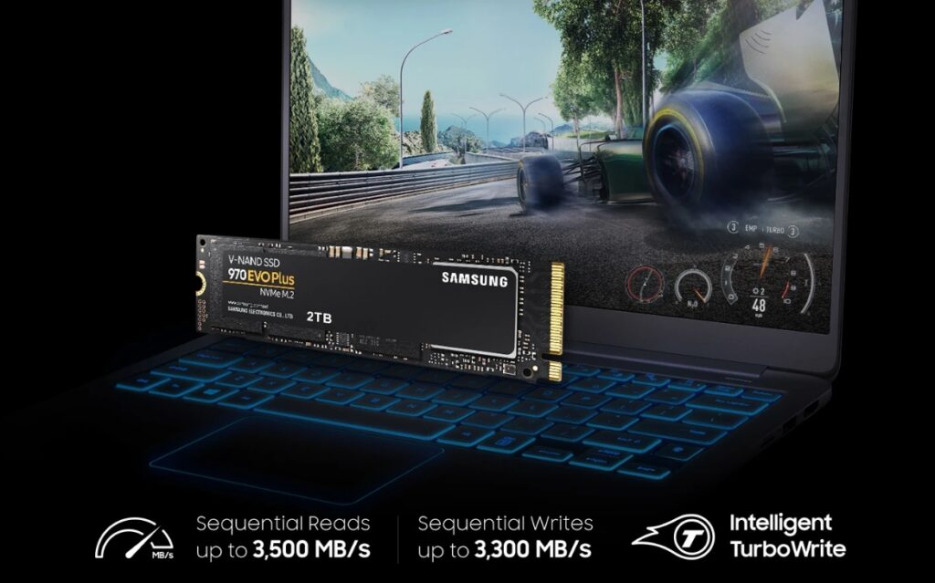 The 970 EVO Plus reaches sequential read/write speeds up to 3,500/3,300 MB/s, up to 53%* faster than the 970 EVO. Powered by the latest V-NAND technologywhich brings greater NAND performance and higher power efficiencyalong with optimized firmware, a proven in-house controller, and Intelligent TurboWrite boost speed.
