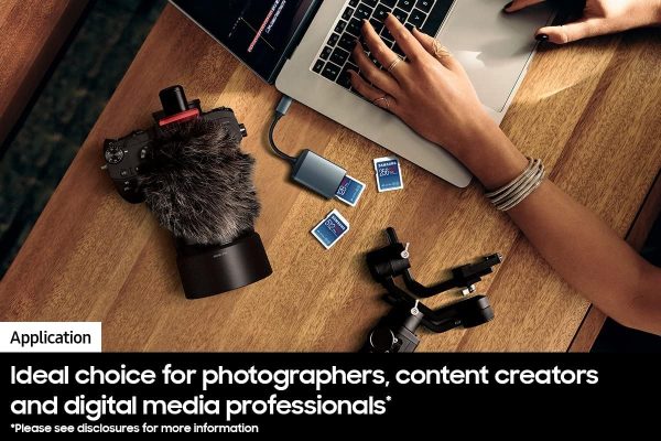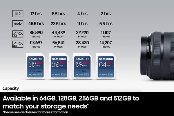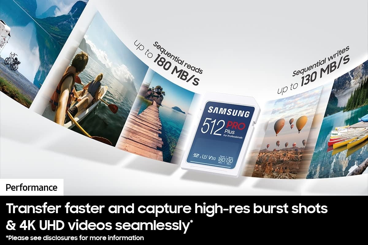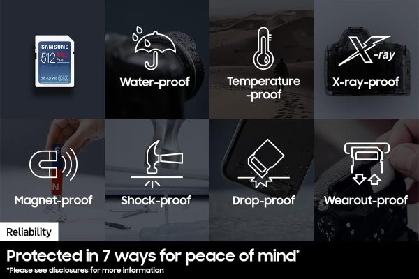 Unleash extreme speed. The SD Card made for professionals. Samsung SD Card is the right memory card that enables quick transfer of a large number of files with its high performance. 1Source: 2003-2022 Q3 OMDIA data: NAND suppliers?? revenue market share. 2The foregoing read & write speed performance is based on testing of 512GB capacity under standard conditions. Actual speeds may vary depending upon card capacity. For products incompatible with UHS-I interface, the speeds may vary subject to different interface conditions. 3Host device compatibility may vary. ?Test Device: Sony Alpha 1. ?Image 3840*2880 (Avg Pic size 5.5 MB). ?Samsung is not liable for any i) damages and/or loss of data or ii) expenses incurred from memory card data recovery. ?Waterproof: 1M depth, salt water, 72hrs. ?Temperature proof: Operating temperatures of -25??C to 85??C, non-operating temperatures of -40??C to 85??C. ?X-ray Proof: 100mGy (equal to airport Xray machines). 1?Magnet-proof: Up to 15,000 gauss. 11Shock proof: shock up to 1,500g* (g*: gravitational acceleration). 12Drop: withstand drops up to 5 meters (16.4 feet). 13Wearout: up to 10,000 swipes.