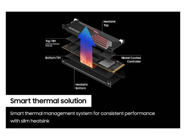 *Sequential and random write performance was measured with Intelligent Turbo Write technology being activated. Intelligent Turbo Write operates only within a specific data transfer size. Performance may vary depending on SSDs firmware, system hardware & configuration and other factors. For detailed information, please contact your local service center. Test system configuration: AMD Ryzen 7 5800X 8-Core Processor CPU@3.80GHz, DDR4 3600MHz 16GBx2 (PC4-25600 Overclock), OS – Windows 10 Pro 64bit, Chipset – ASRock-X570 Taichi. **980 PRO Sequential Read/Write – 1,129/877 MB/Watt, 990 PRO Sequential Read/Write – 1380/1319 MB/Watt based on internal test result of 1TB capacity model. ***PCI-SIGD8 standard spec: 8.8mm. ****DirectStorage technology from Microsoft loads games faster than before by leveraging the multiple GB/sec speed of modern NVMe SSDs. Results are based on a comparison with Samsung 980 PRO. *****Source: 2003~2021 OMDIA data – NAND suppliers’ revenue market share. ******PCIe 4.0s best theoretical sequential read is 8000 MB/s – 990 PRO reaches 7,450 MB/s as of Q3, 2022.