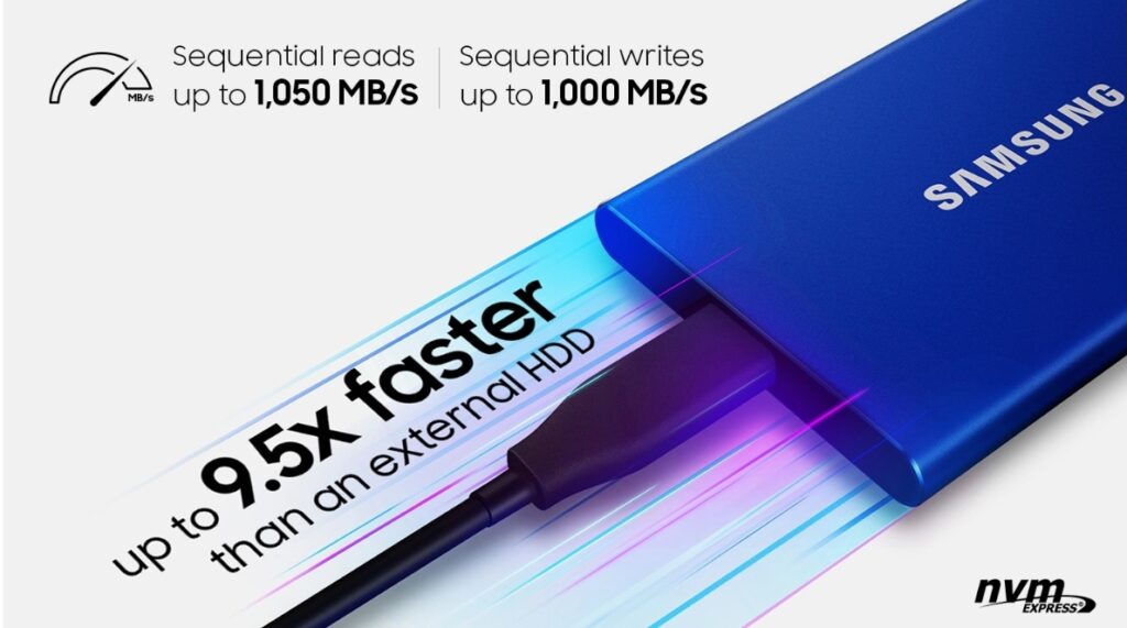 TRANSFER IN A FLASH: Transfers files nearly 9.5x faster than external hard disk drive (HDD). Reads up to 1,050 MB/s / Writes up to 1,000 MB/s on USB 3.2 gen 2 supported devices*.