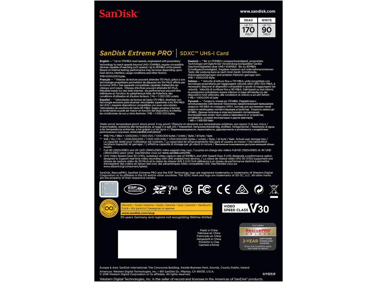 | Features | Built for and tested in harsh conditions: Temperature-proof, waterproof, shockproof, and x-ray-proof, Capture uninterrupted video with UHS Speed Class 3 (U3) and Video Speed Class 30 (V30), Perfect for shooting 4K UHD video and sequential burst mode photography |