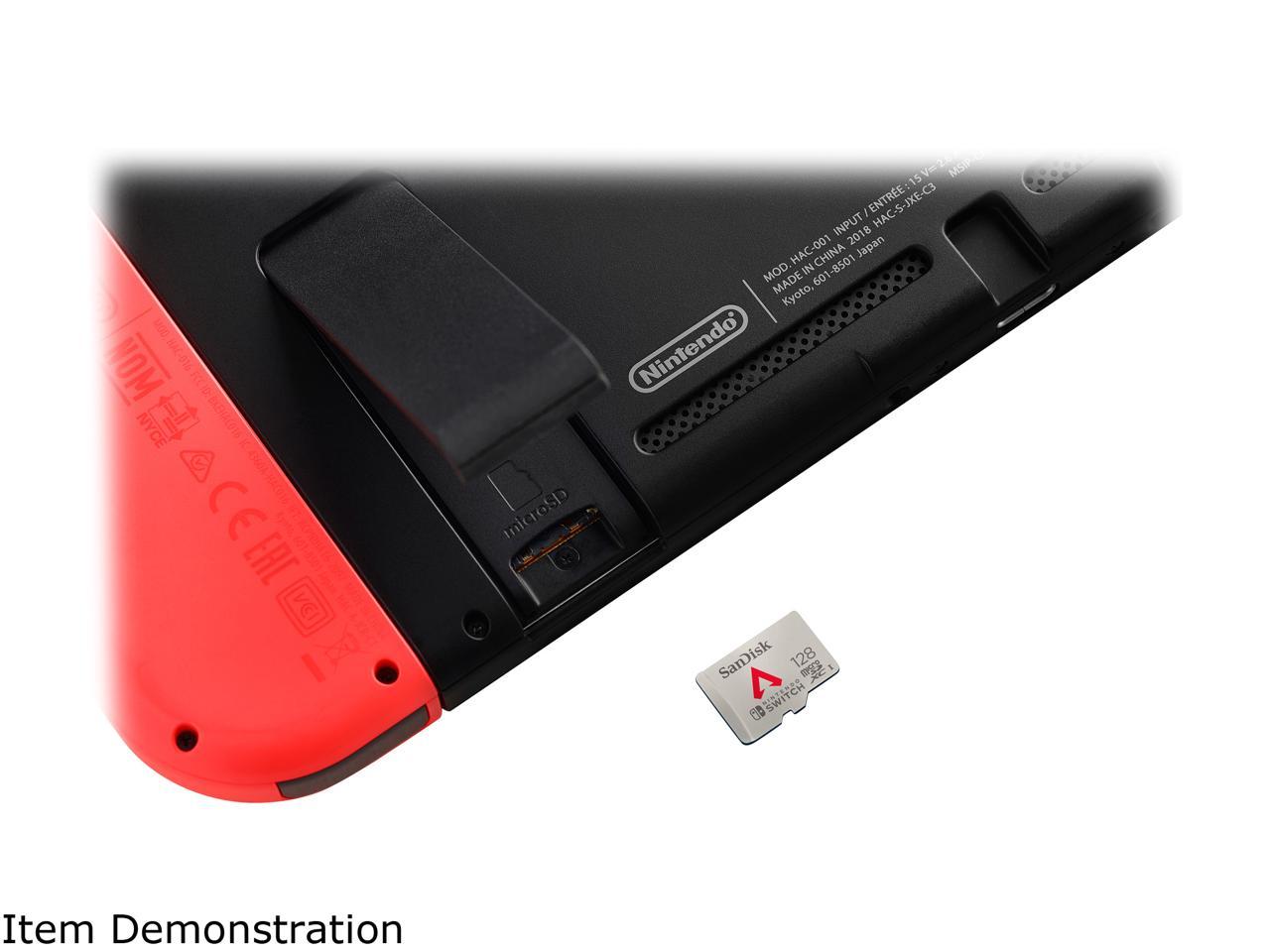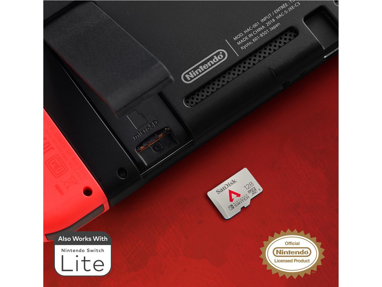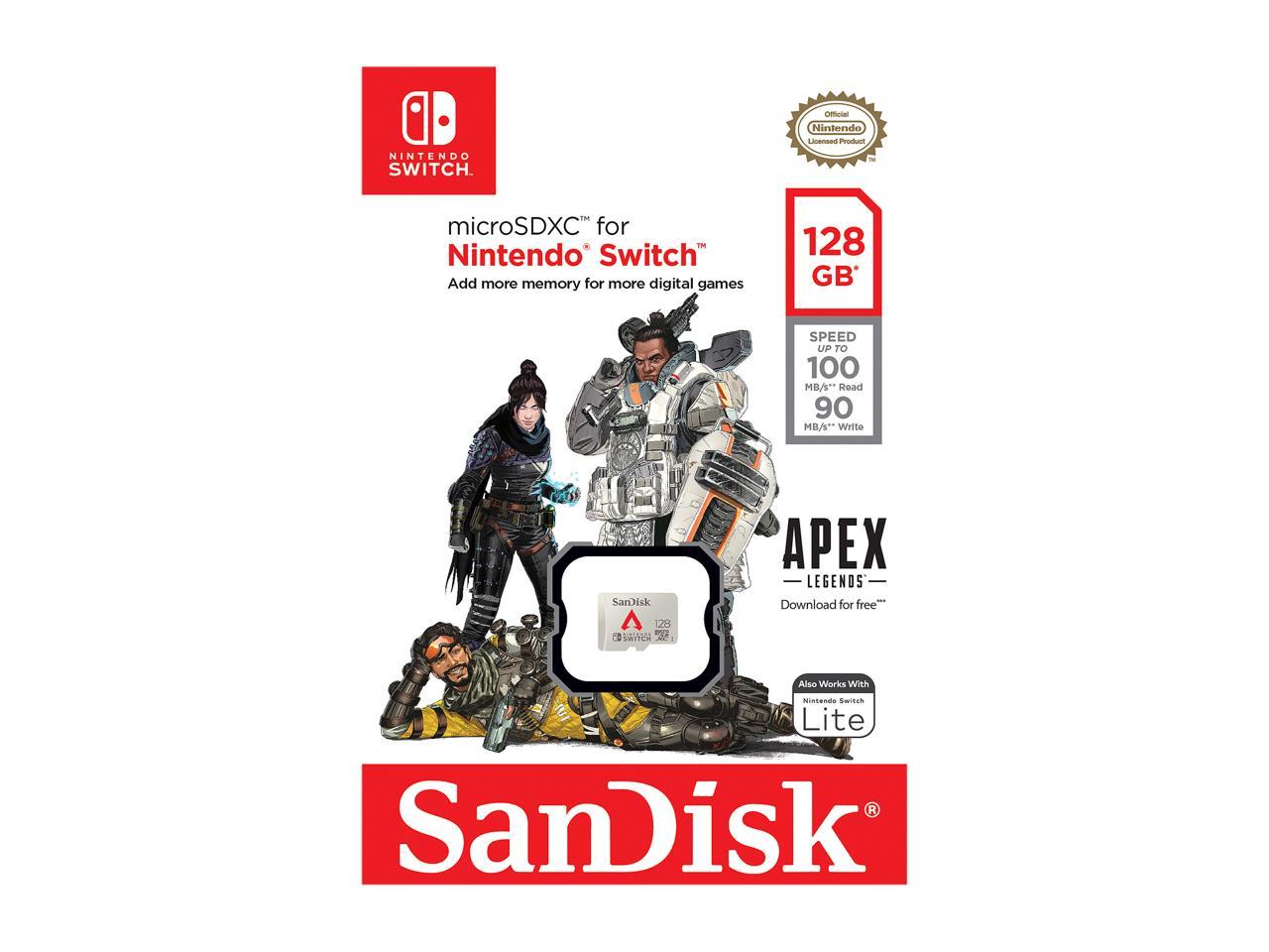 | Features | Add up to 128GB of storage to your Nintendo Switch system in a matter of seconds, and rest easy knowing you have room for your favorite games., Get in the Game Fast, Nintendo-licensed for the Nintendo Switch console, Room to Explore, Store More, Carry Less, The SanDisk microSDXC card for the Nintendo Switch game system is designed to provide dependable storage as you conquer new levels., With the SanDisk microSDXC for Nintendo Switch, you're able to keep Apex Legends and your other favorite digital games in one place so you're ready for game time anytime., With transfer rates up to 100MB/s, the SanDisk microSDXC card for Nintendo Switch delivers consistent high performance so you can load games fast and crush the competition. |