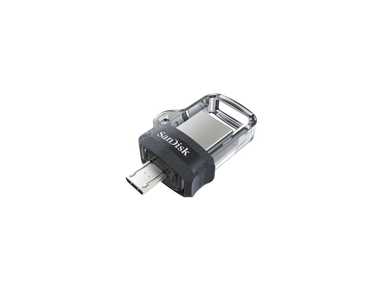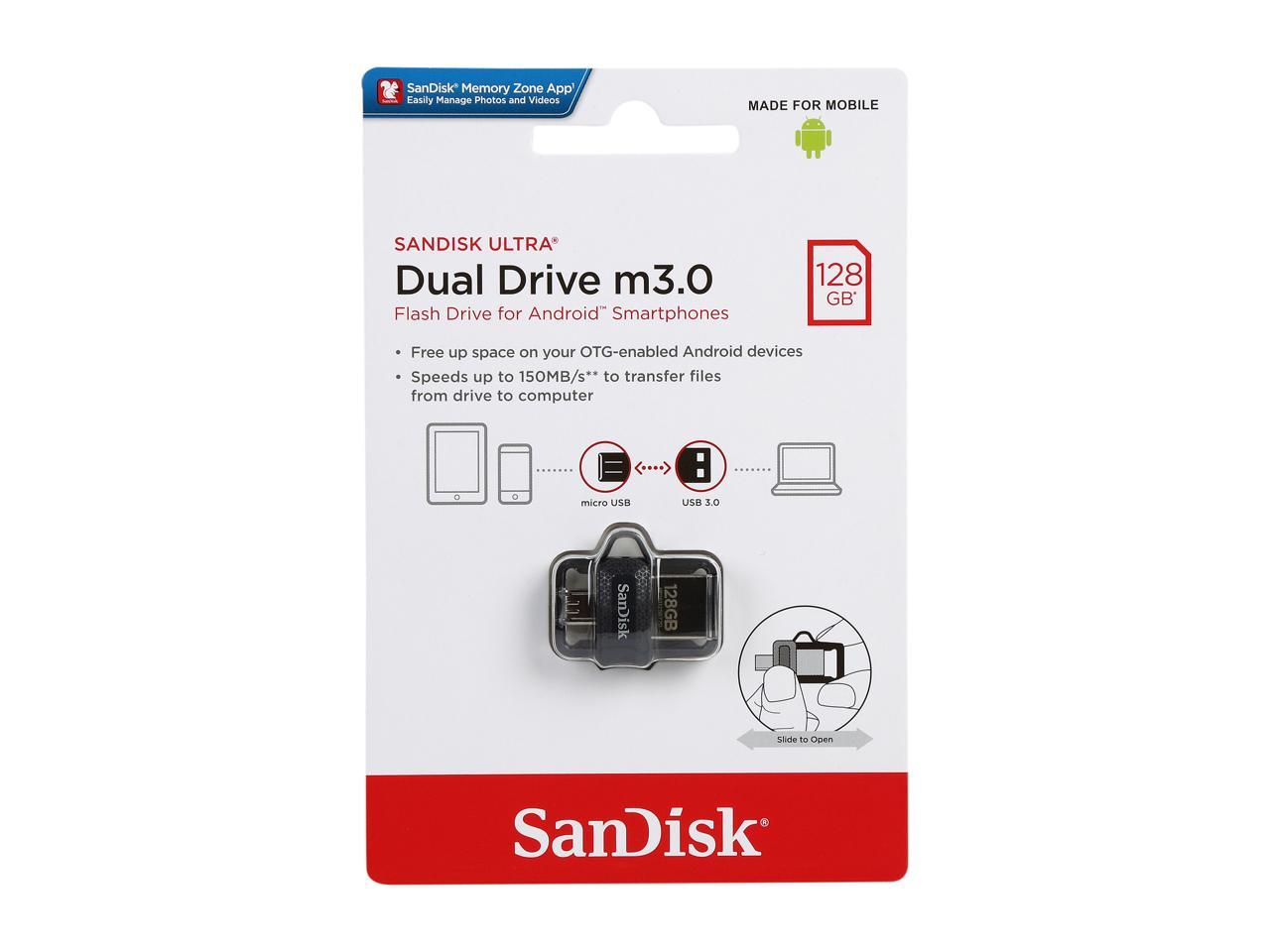 | Features | Compatible with OTG-enabled Android Devices, Dual micro-USB and USB 3.0 Connectors, Easily Move Content Between Computers and Android Devices, Free up Memory on Your Smartphone and Tablet, High-speed USB 3.0 for Super-Fast File Transfers of up to 150MB/s**, High-speed USB 3.0 lets you transfer a full-length movie to the drive faster than with a standard USB 2.0 drive, up to 150MB/s, Quickly free up space on your Android smartphone or tablet so you can take more pictures and videos., SanDisk Memory Zone app for easy file management, Sleek, retractable design offers both micro-USB and USB 3.0 connectors. The USB 3.0 connector is high-performance and backward-compatible with USB 2.0 ports., The SanDisk Ultra Dual Drive m3.0 is compatible with Android smartphones and tablets featuring OTG (On-The-Go) USB support., The SanDisk Ultra Dual Drive m3.0 lets you move and share files between Android devices and desktop or laptop computers. |