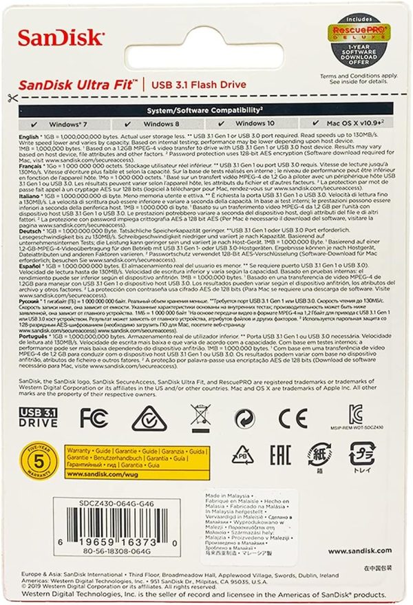 The simple way to add extra, high-speed storage to your device! The SanDisk Ultra Fit USB 3.1 Flash Drive delivers performance that allows you to move a full-length movie faster than with standard USB 2.0 drives.(1) Plus, thanks to its compact, streamlined design, you can plug it in and leave it in. 1GB=1,000,000,000 bytes. Actual user storage less (1)Write faster than standard USB 2.0 drives (4MB/s); up to 130MB/s read speed. USB 3.1 Gen 1 or USB 3.0 port required. Based on internal testing; performance may be lower depending on host device. 1MB=1,000,000 bytes (2)Write faster than standard USB 2.0 drives (4MB/s). USB 3.1 Gen 1 or USB 3.0 port required. Results may vary based on host device, file attributes and other factors. (3)Password protection uses 128-bit AES encryption and is supported by Windows 7, Windows 8, Windows 10 and macOS v10.9+ (Software download required for Mac, visit the official SanDisk website for SecureAccess details) (4)Registration required; terms and conditions apply..