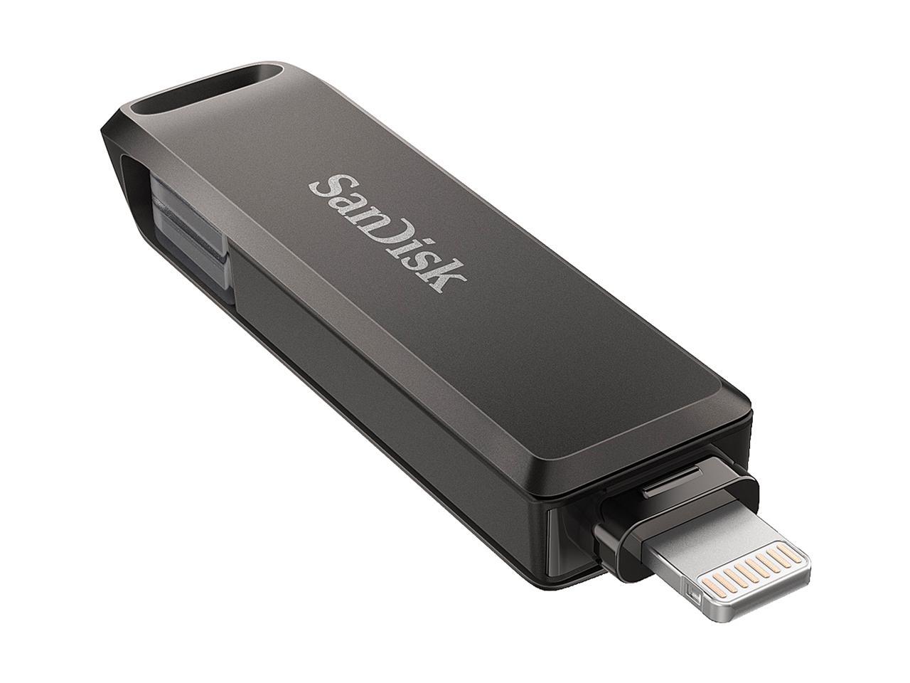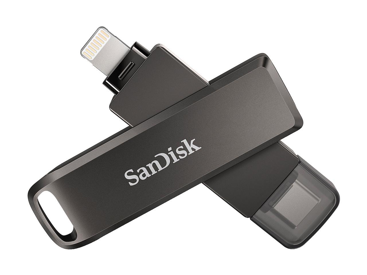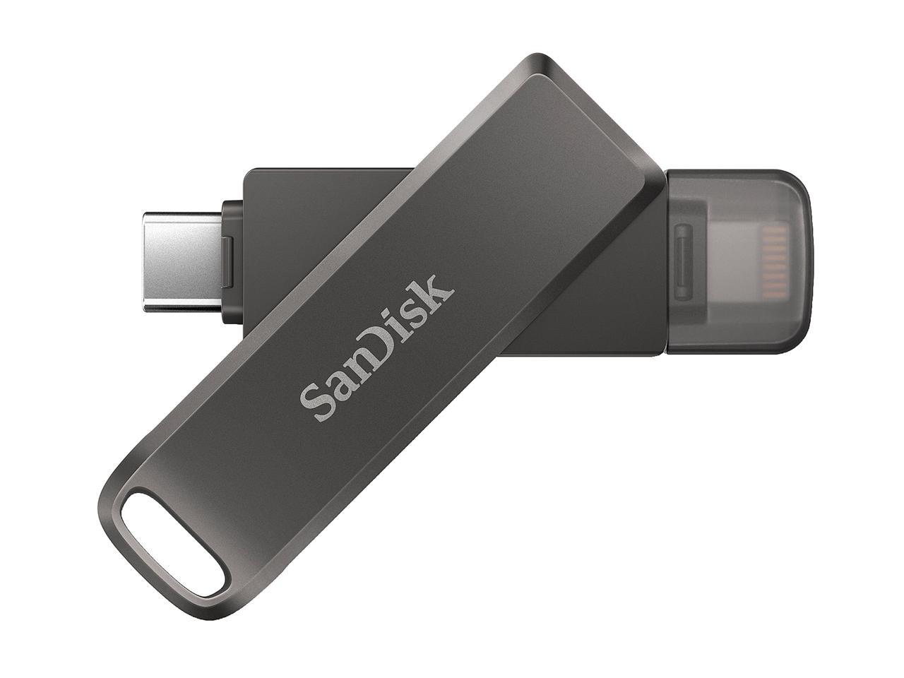 A stylish swivel design protects the connectors when you toss the drive in your bag or pocket, and a keyring hole makes it easy to take it with you on the go., An easy way to free up space, Automatic backup is just a plug-in away, Dual-purpose swivel with keyring hole, Just plug in the drive and quickly free up space. No internet required to transfer files. Now you have the memory you need for more photos, videos and games., No more losing those special memories. Photos and video are automatically backed up on your iPhone every time you plug in the drive. It's that simple., One drive. Two connectors., Password-protect your files, Quickly move content to your computer, Say goodbye to emailing photos between devices. Once files are on your drive, you can use the high-speed USB 3.0 connector to transfer them to your USB Type-C computer., The SanDisk iXpand Flash Drive Luxe comes with not one but two connectors so you can easily move files between your iPhone, iPad Pro, Mac, and USB Type-C devices, including Android phones., Want to keep your files private when you share your drive Use the iXpand Drive app to password-protect your files and photos across iOS devices and PC computers.
