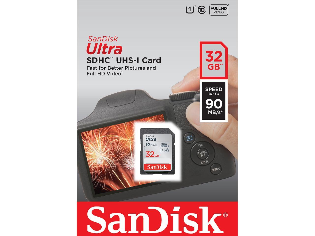 Don't miss the moment, SanDisk Ultra cards are fast with exceptional video recording performance to let you capture your memories when they happen., Picture-and video-perfect, Capture amazing quality pictures and Full HD video with your compact point-and-shoot camera., Keep shooting, Delivers 32GB to 256GB of storage so you can shoot tons of photos and hours of Full HD video (1080p) without changing the card., Resistant to water, temperature fluctuations, and more, SanDisk Ultra SDHC and SDXC UHS-I cards are durability tested to protect your memories from life's mishaps-waterproof, shockproof, x-ray proof, and temperature-proof.