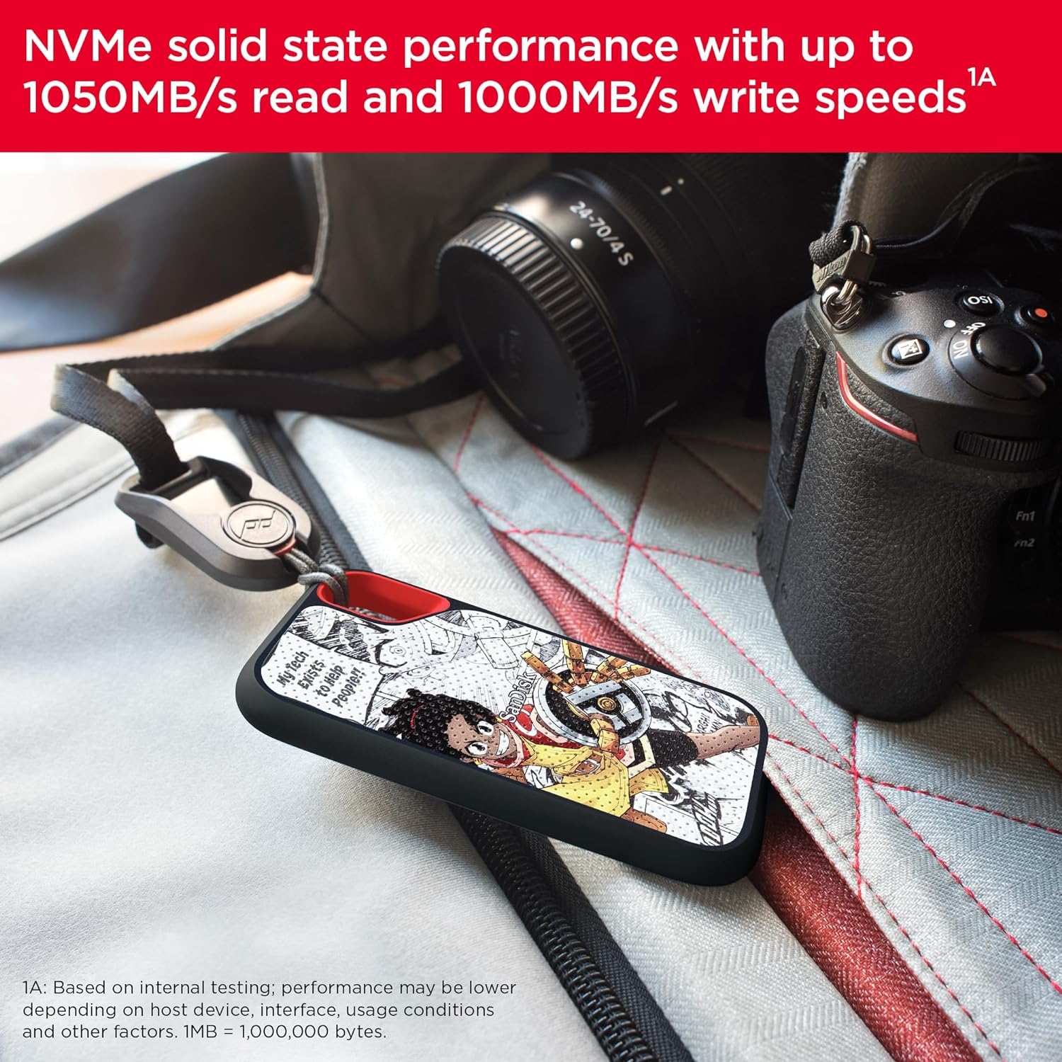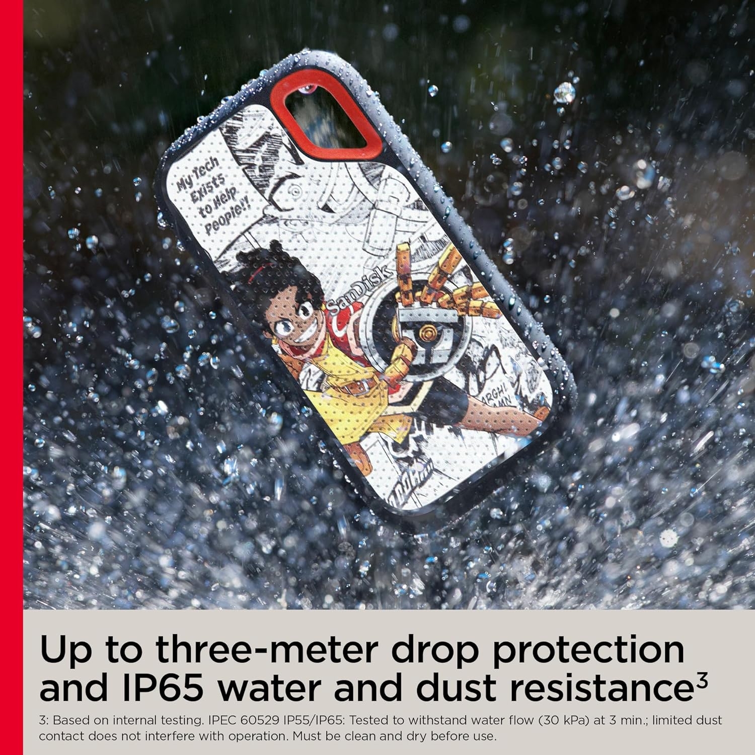 Your lifes an adventure. To capture and keep its best moments, you need fast, high-capacity storage that accelerates every move. 1050MB/s read and 1000MB/s write speeds let you store your content and creations on a fast drive that fits seamlessly into your active lifestyle. Up to two-meter drop protection (3), with IP55 water and dust resistance (3), a Carabiner loop for securing the drive. From the brand trusted by professional photographers, the SanDisk Extreme Portable SSD provides fast solid state performance in a tough, reliable storage solution. | 1GB = 1,000,000,000 bytes, 1TB = 1,000,000,000,000 bytes. Actual user capacity less. | Up to 1050MB/s read speed, up to 1000MB/s write speed. Engineered with proprietary technology to reach speeds beyond UHS-I 104MB/s, requires compatible devices capable of reaching such speed. Based on internal testing; performance may be lower depending on host device, interface, usage conditions and other factors. 1MB=1,000,000 bytes. | (1) See official SanDisk website. | (2)Password protection uses 256-bit AES encryption and is supported by Windows 8, Windows 10 and macOS v10.9+ (Software download required for Mac, see official SanDisk website.) | (3)Based on internal testing. IPEC 60529 IP 55: Tested to withstand water flow (30 kPa) at 3 min.; limited dust contact does not interfere with the operation. Must be clean and dry before use.