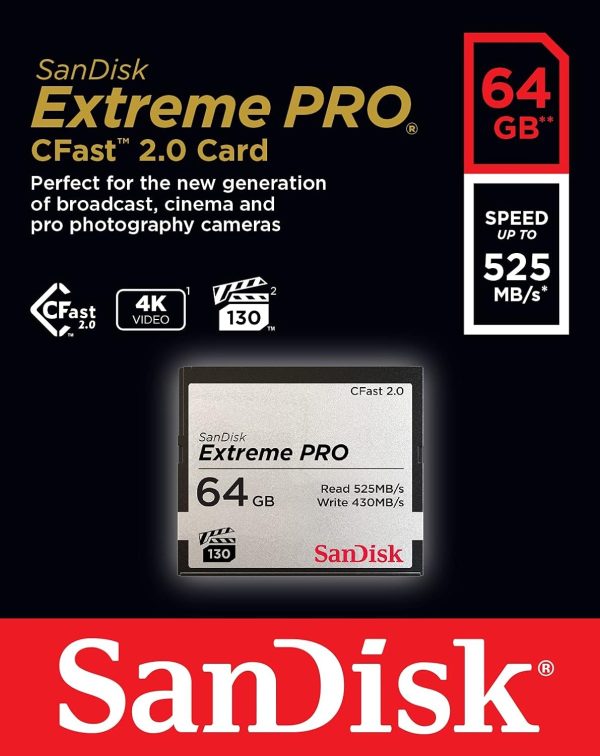 The SanDisk Extreme PRO CFast 2.0 memory card delivers the high performance that broadcast, cinema, and photography professionals demand today. The card features a Video Performance Guarantee of 130MB/s (VPG 130)(4) which enables cinema-quality 4K video recording (4096x2160p)(1). And its write speeds of up to 450MB/s* and data transfer speeds of up to 525MB/s* provide extreme workflow efficiency. Our second generation CFast card, the SanDisk Extreme PRO CFast 2.0 memory card was designed in collaboration with leading-edge camera manufacturers to assure an exceptional user experience from the first shot.|* Up to 525MB/s read speed; up to 430MB/s write speed. Based on internal testing; performance may be lower depending upon host device. 1MB=1,000,000 bytes.|(1) 4K video (4096x2160p) support may vary based upon host device, file attributes and other factors.|(4) Video Performance Guarantee enabled to support cinema-quality 4K video recording at 130MB/s minimum sustained write speed.