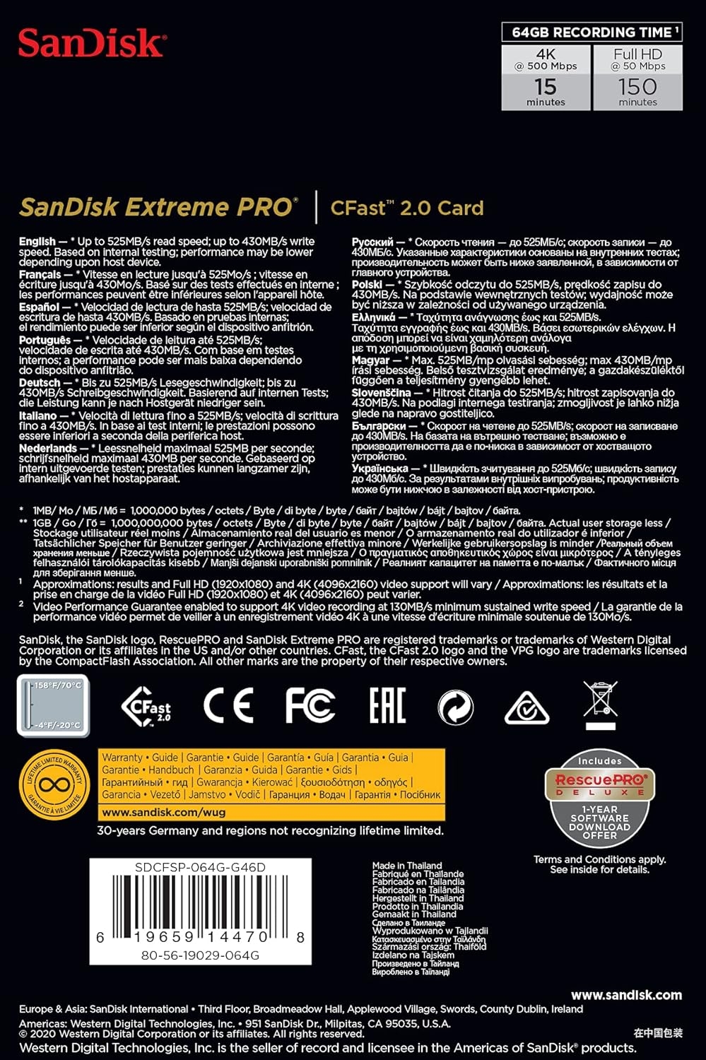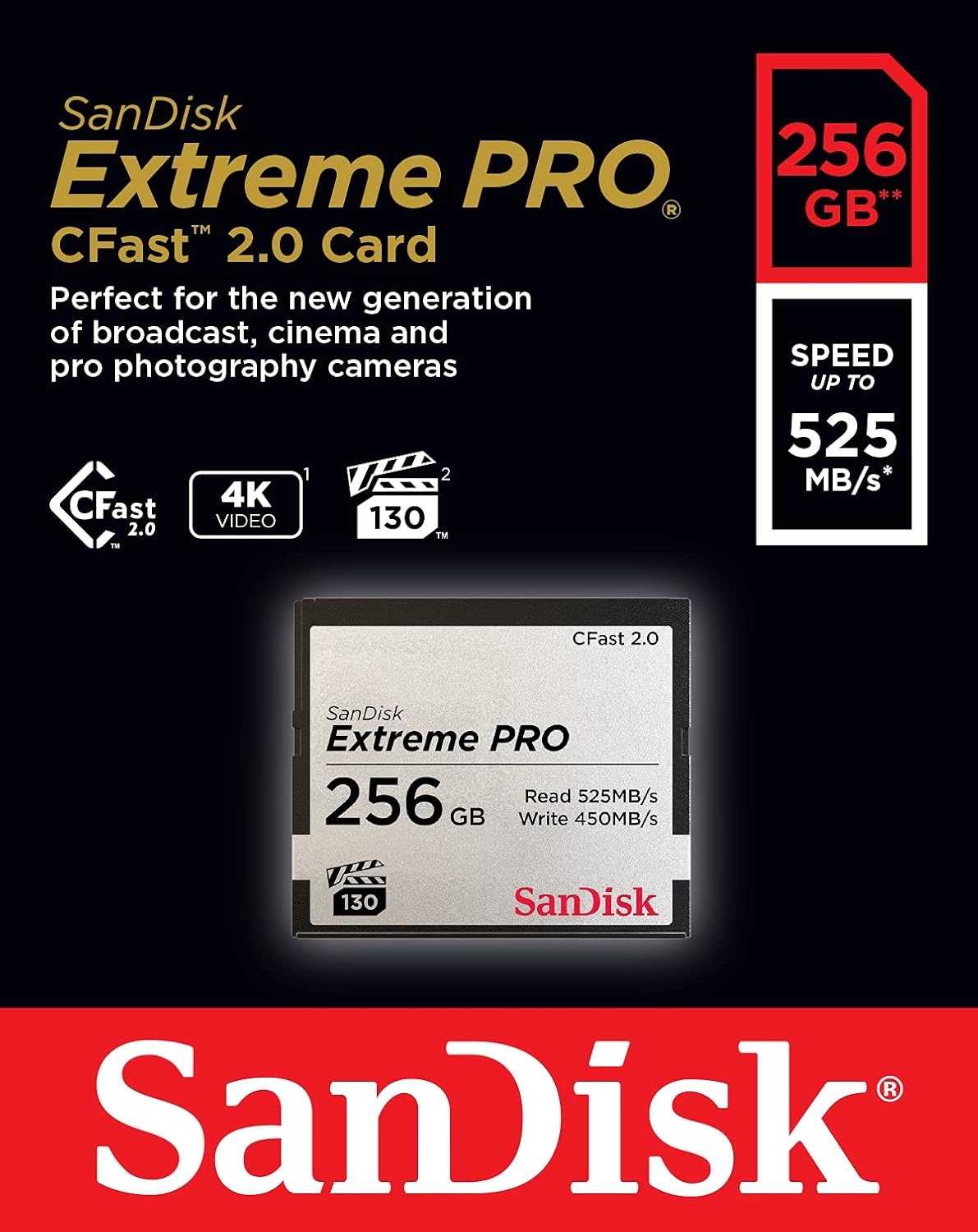 The SanDisk Extreme PRO CFast 2.0 memory card delivers the high performance that broadcast, cinema, and photography professionals demand today. The card features a Video Performance Guarantee of 130MB/s (VPG 130)(4) which enables cinema-quality 4K video recording (4096x2160p)(1). And its write speeds of up to 450MB/s* and data transfer speeds of up to 525MB/s* provide extreme workflow efficiency. Our second generation CFast card, the SanDisk Extreme PRO CFast 2.0 memory card was designed in collaboration with leading-edge camera manufacturers to assure an exceptional user experience from the first shot.|* Up to 525MB/s read speed; up to 430MB/s write speed. Based on internal testing; performance may be lower depending upon host device. 1MB=1,000,000 bytes.|(1) 4K video (4096x2160p) support may vary based upon host device, file attributes and other factors.|(4) Video Performance Guarantee enabled to support cinema-quality 4K video recording at 130MB/s minimum sustained write speed.