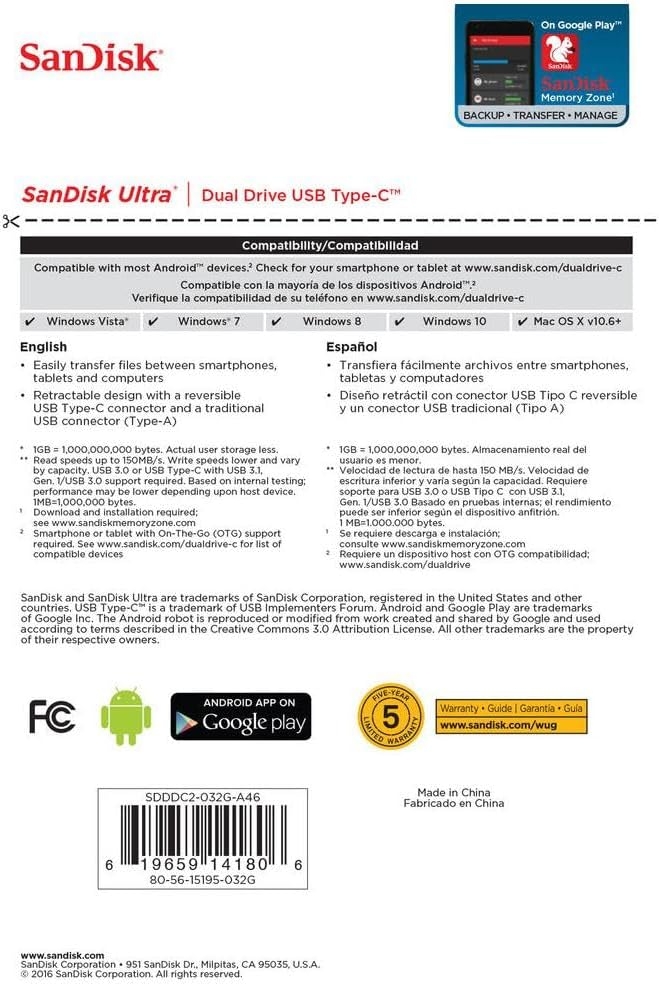 Easily free up space on your smartphone or quickly transfer files between devices at USB 3.1 High speeds of up to 150MB/s. With a reversible USB Type-C connector and a traditional USB connector, the Sandisk Ultra dual drive USB Type-C lets you quickly and easily transfer files between smartphones, tablets and computers. Plus the Sandisk memory zone app for Android helps you manage your device’s memory and your content. The Sandisk Ultra dual drive USB Type-C is the perfect liaison between your USB Type-C device and your devices with traditional USB ports.