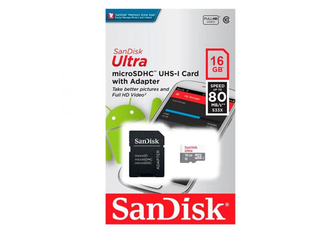 SanDisk SDSQUNS-016G CUQ 16GB 8p MSDHC r80MB/s 533x Class 10 UHS-1 SanDisk Ultra Micro Secure Digital High Capacity Card Bulk