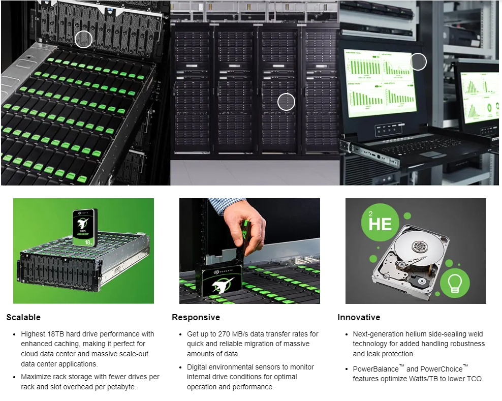 The market-leading 18 TB HDD offers the highest capacity, with more petabytes of data per rack.