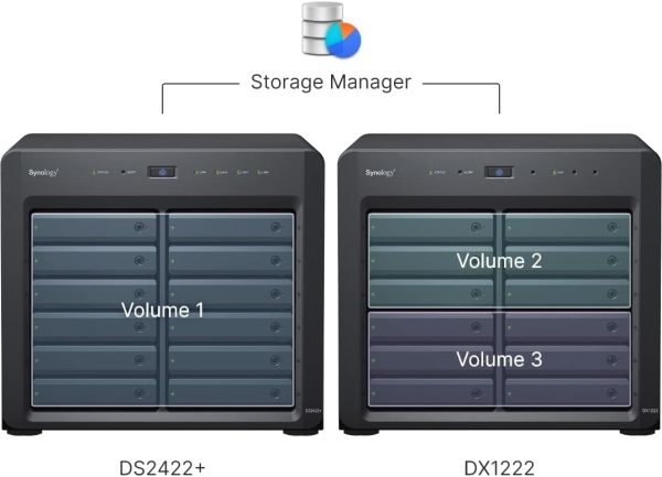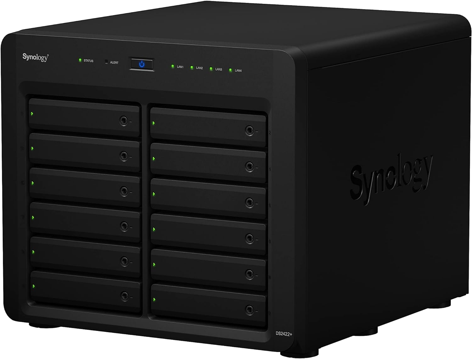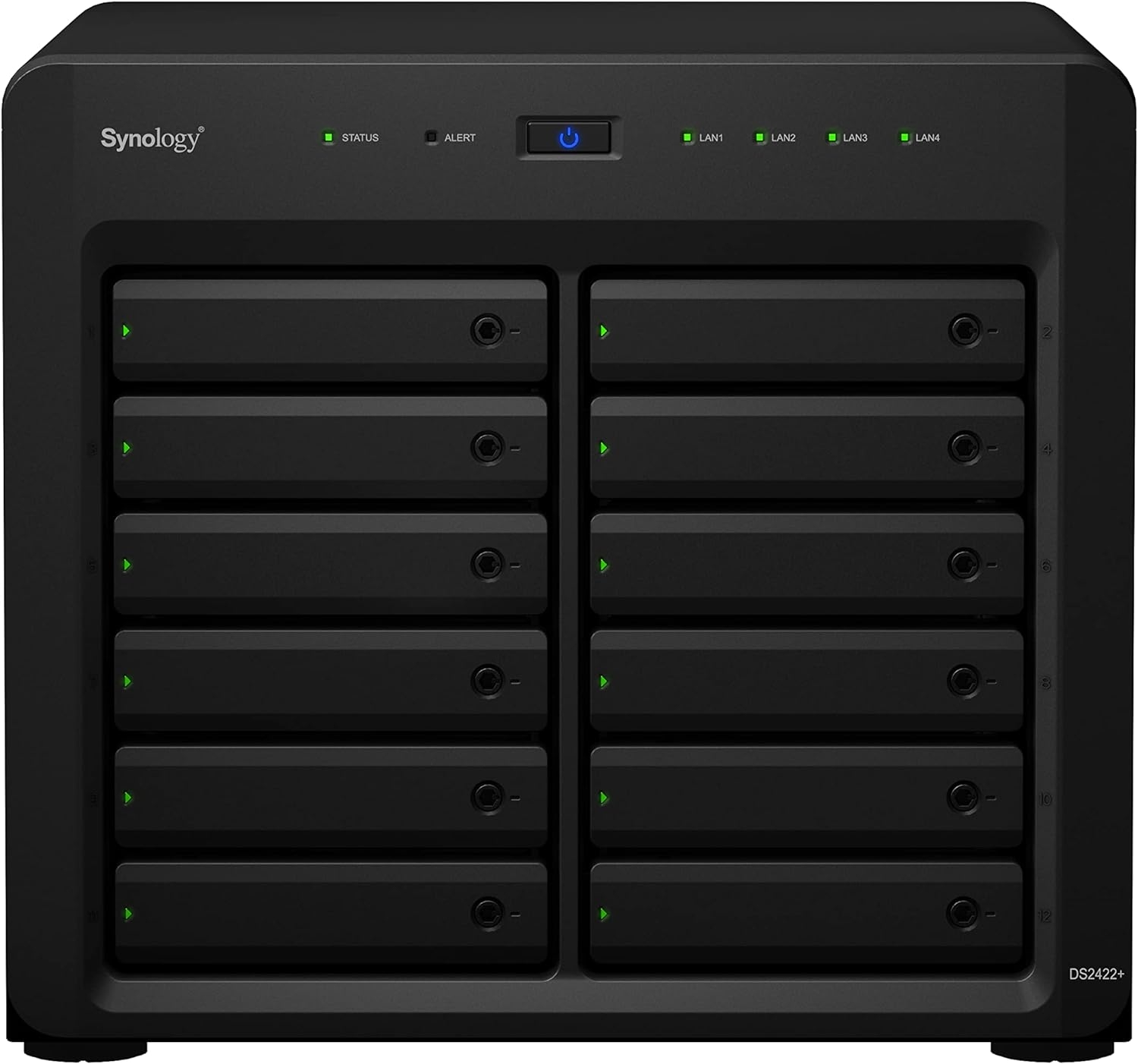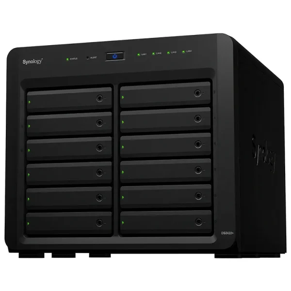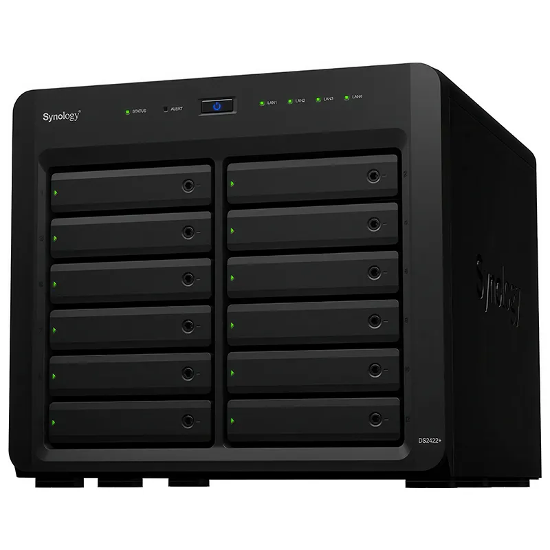 Synology DiskStation DS2422+ is a compact 12-bay desktop NAS that takes file sharing and management to the next level. The unit can be scaled to 24 drive bays and excels at serving large data sets in multiuser environments. It comes with powerful file management, surveillance, and backup capabilities, and can serve as high-quality video and VM storage. With support for up to 32 GB of memory, NVMe SSD cache, and 25GbE network cards, the DS2422+ is ready for large-scale business applications.