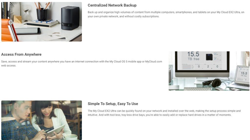 Simple to Setup, Easy to Use: The My Cloud EX2 Ultra can be quickly found on your network and installed over the web, making the setup process simple and intuitive. And with tool-less, tray-less drive bays, you’re able to easily add or replace hard drives in a matter of moments.
