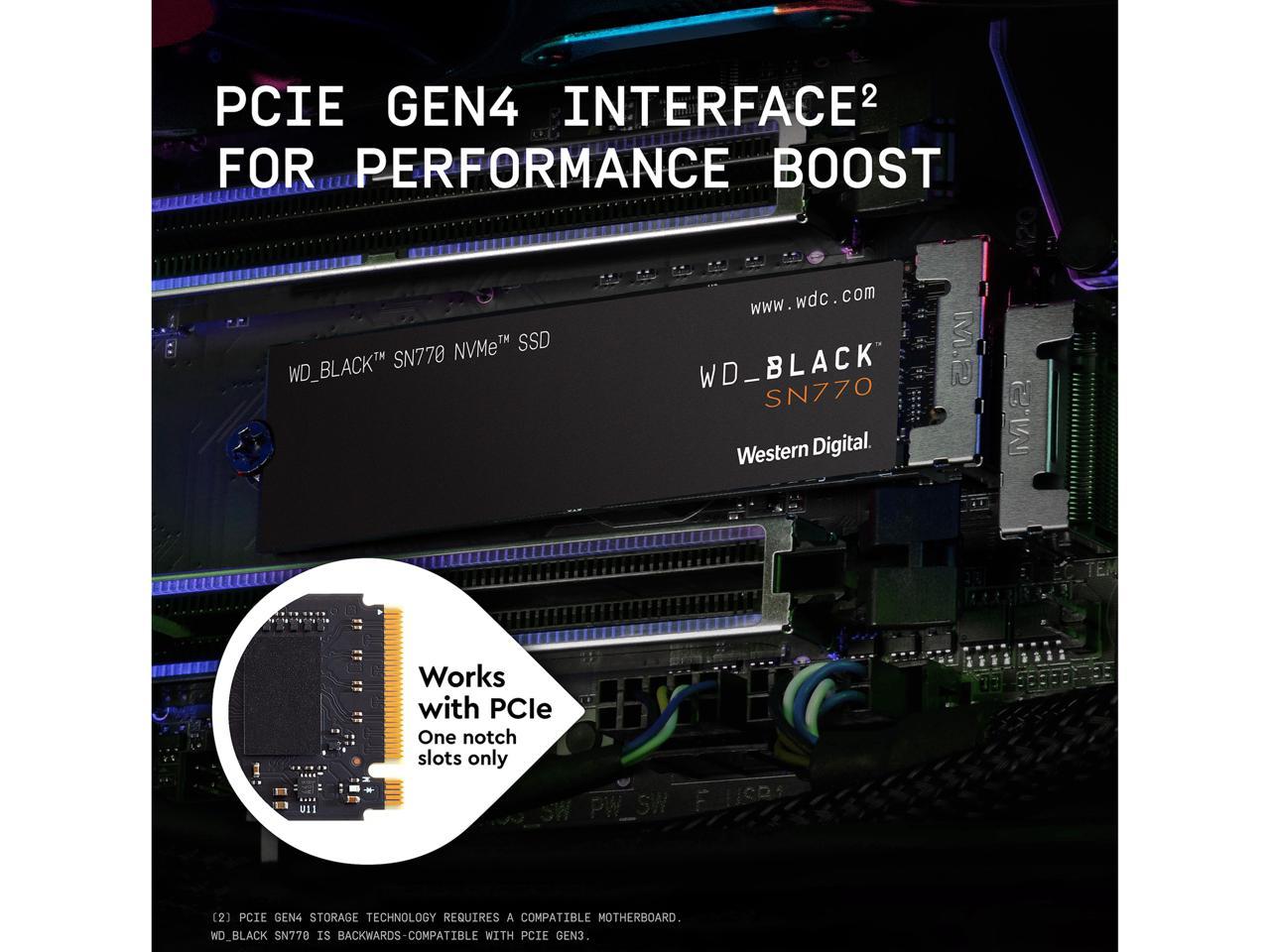 • Equipped with a PCIe Gen4 interface, the WD_BLACK SN770 NVMe SSD helps fuel in-game responsiveness, minimize stutter, and provide smooth streaming for a performance boost you can see and feel.